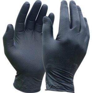 Black nitrile gloves with superior puncture resistance and a diamond dimple grip. Powder-free and chemical-resistant. Ideal for heavy-duty use. Box of 50.