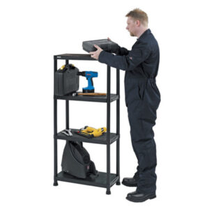 €54 INC. VATA 4 tier shelving rack ideal for use in workshops, garages, sheds around the home or office. Simple push together assembly, a great temporary or permanent storage solution. Lightweight, manufactured from robust black polymer.