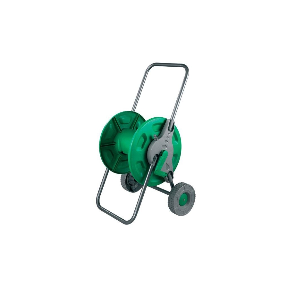 Wheeled hose trolley. Robust, easy snap together system. Holds up to 60m of hosepipe. Made of polymer PP and epoxy painted steel tube. Packed in a full color display carton.