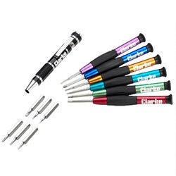 This precision screwdriver set contains an aluminium screwdriver handle with 6 chrome vanadium bits (3 x Torx and 3 x Hex). There are also 3 x Philips and 3 Torx screwdrivers. The 6 screwdrivers are colour coded for easy identification and have thermoplastic rubber (TPR) handles for comfortable use. Features