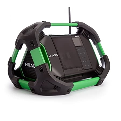 Built-in protection storage case for smartphone • Bluetooth wireless technology • DAB/DAB+ receiver • IPX4 water resistance • Audio playback • USB charging function • Folding FM rubber antenna, and built-in ferrite bar AM antenna • Compatible with the range of Hitachi 18V slide Li-Ion batteries from 1.5Ah to 6.0Ah • Can be operated with the included AC adapter