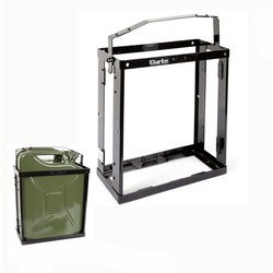 Bracket for securely attaching a standard 20 litre jerry can on-board a vehicle. Features