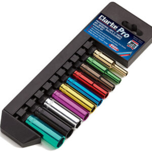 A set of 10 high quality 1/4″ drive, colour coded metric sockets supplied in a convenient storage hanging rail.