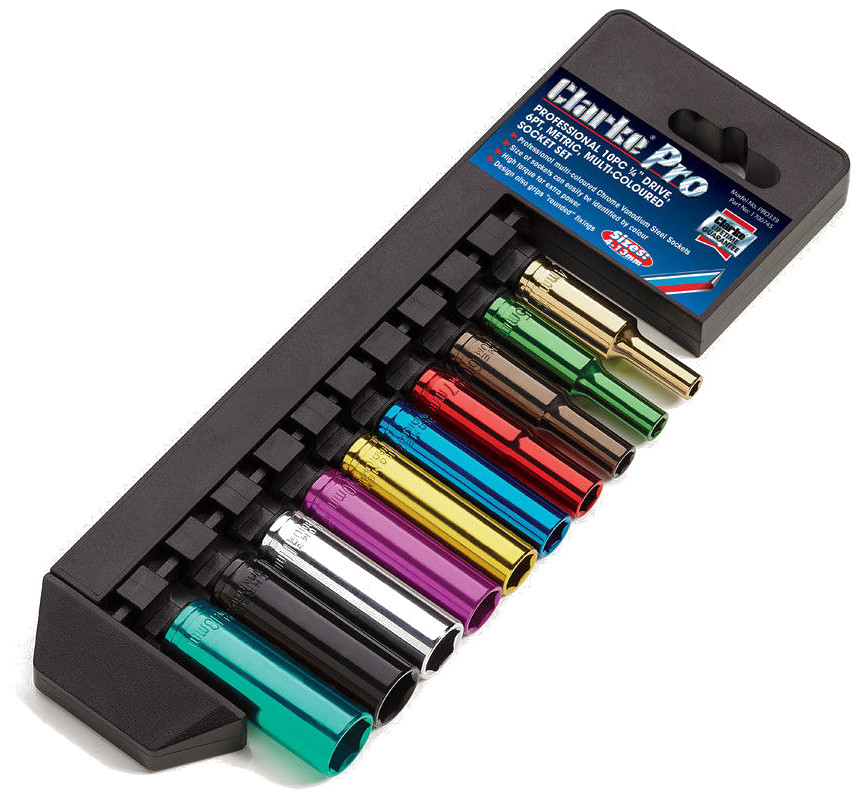 A set of 10 high quality 1/4″ drive, colour coded metric deep sockets supplied in a convenient storage hanging rail.