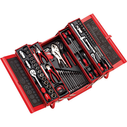 This 5 tray steel cantilever tool box contains 90 commonly used tools. Individual tool position inserts and outline drawing of sockets etc allow items to be easily located.