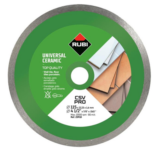 The diamond blade from the manufacturer Rubi with the designation CSV 125 PRO is suitable for demanding conditions. It is designed for dry cutting in hard building materials such as concrete and brick. The outer diameter of the blade is 125 mm. Inner diameter 22.2 mm. The individual disc segments are 8 mm high and 1.6mm thick.