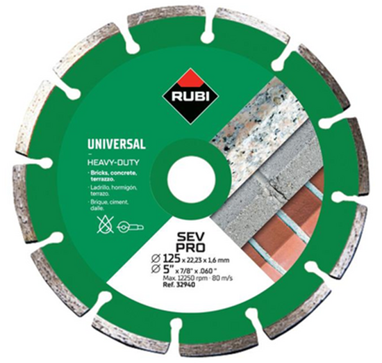 The diamond blade from the manufacturer Rubi with the designation SEV 230 PRO is suitable for demanding conditions. It is designed for dry cutting in hard building materials such as concrete and brick. The outer diameter of the blade is 230 mm. Inner diameter 22.2 mm. The individual disc segments are 8 mm high and 2.3 mm thick.