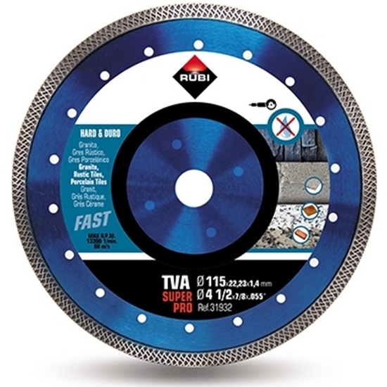 The diamond blade from the manufacturer Rubi with the designation TVA 230 SUPERPRO is suitable for demanding conditions. It is designed for dry cutting in hard building materials such as granite, rustic tiles, clinker, refractory, slate, quartzite and porcelain tile. The outer diameter of the blade is 230 mm. Inner diameter 22.2 mm. The individual disc segments are 8 mm high and 1.6mm thick.