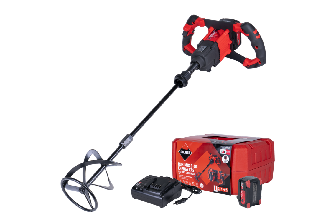 The RUBIMIX E-10 ENERGY CAS battery powered electric mixer is ideal for mixing cementitious adhesives, resins, paints, and other materials.