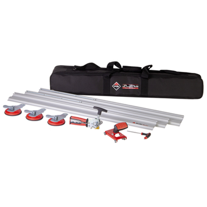 The set consists of 3 guides of 110 cm; 1 scoring carriage with Ø22 mm EXTREME roller; 1 separating pliers; 3 fixing suction cups, and a reinforced nylon carry bag. The guides are made of aluminum and are assembled together to guarantee a perfect score, always 1 cm from the edge of the guide itself. The suction cups will help us to fix the guide on the tile and prevent it from moving. The guides also have two silicone strips to help fixation. The scoring carriage, with a handle to facilitate the work, mounted with a Ø 22 mm tungsten carbide scoring wheel with bearings, especially to carry out those jobs with longer scores. The pliers are in charge of making sure that we can separate the tile after scoring, allowing us to work with materials up to 10 mm thick. For pieces with thicknesses from 11 to 15 mm, the use of the SLIM SEPARATOR (ref. 18917) is recommended. This entire system is supplied in a practical textile bag with interior compartments and with the necessary tools for assembly. The SLIM CUTTER PLUS manual cutter is a cutting system specially designed for porcelain sheets of large dimensions and fragile at the same time, so it is very interesting to be able to make the first cut before moving them. The way of working with the SLIM CUTTER PLUS manual cutter is very simple and offers us a solution with guarantees for working with this type of tile. This cutting system, together with the rest of the products in RUBI’s SLAB SYSTEM range, offers the perfect equipment for cutting and laying porcelain sheets of these characteristics, making cutting a simple job and giving us guarantees in the transportation and placement