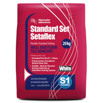 Seta flex White Adhesive of 20kg will cover approximately 5.5m² with a 3mm solid bed application.