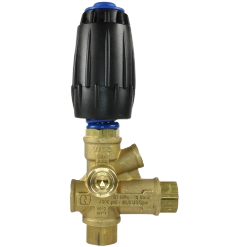 Mecline VRT3 Pressure Regulating Unloader Valve. Hexagonal check valve for a better smoothness. Safety lock at the maximum pressure. Regulation lock for Minimum and Maximum pressure in the knob version. Regulation spring of new concept. New body with inner housing of O-ring in the outlet for a higher resistance. Trapped pressure valve Brass & steel construction Blue cap/spring w/ regulator knob 3/