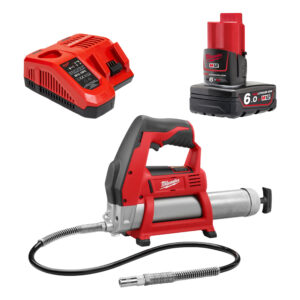 This set includes the Milwaukee 12V Grease Gun Bare Unit ( MILM12GG0 ), the Milwaukee M12B6 12V 6.0Ah Red Lithium-Ion Battery ( MILM12B6 ), and the Milwaukee M12-18 FC Rapid Charger ( MILM1218FC ).