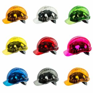 Portwest exclusive design and Patented Model. Translucent shell to see through peak and sides: allows the wearer to look upwards without the need to tilt the head. Extra strong yet ultra lightweight Polycarbonate shell, offering UV rays protection. 6 points textile harness, adjustable size. Vented shell for extra air-flow. CE certified
