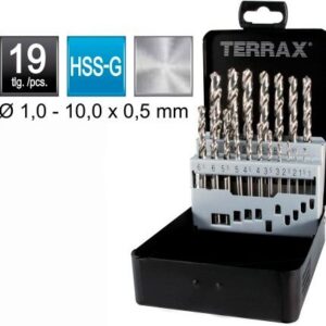 Consisting of: 19 twist drills DIN 338 type N HSS ground. Ø 1,0 mm up to 10,0 mm in increments of 0,5 mm – High performance ground twist drill consisting of heavy-duty high speed steel. The fully ground twist drill has a more precise concentricity. ; Application areas: for steel, alloyed and unalloyed cast iron (up to a strength of 900 N/mm²), grey, malleable, ductile and die-cast iron, sintered i